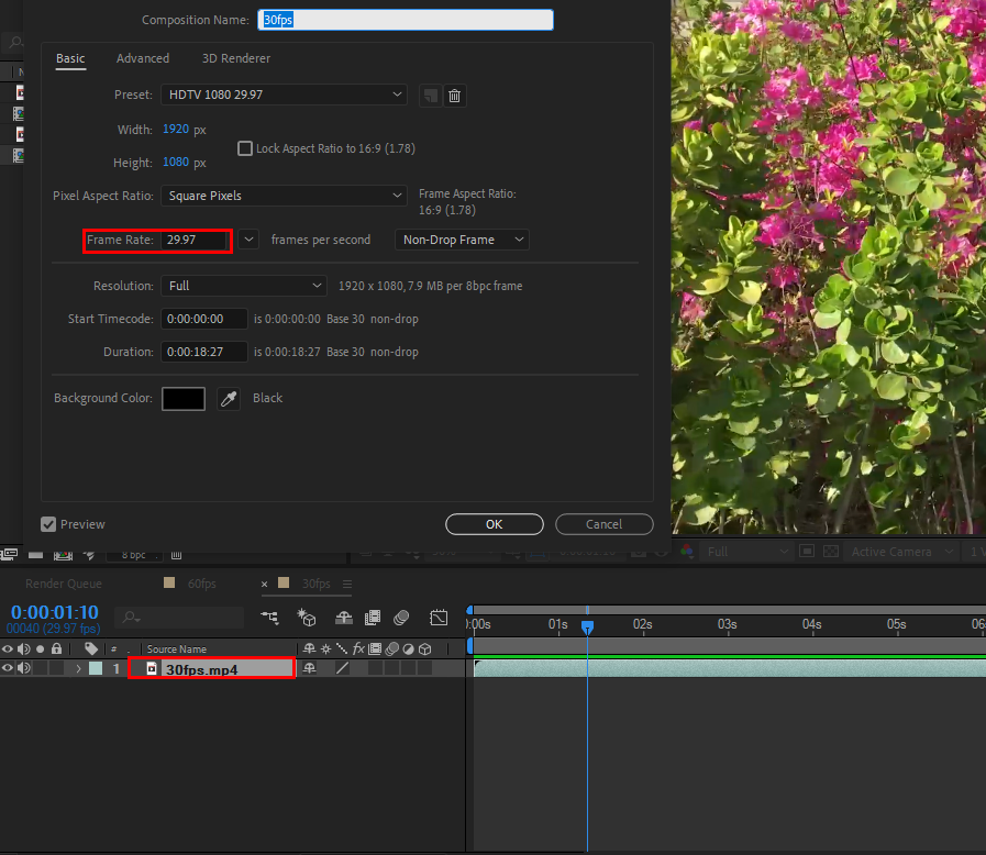 1)프로젝트에 30fps의 동영상을 가져오기하고 30프레임레이트의 컴포지션을 생성합니다.
