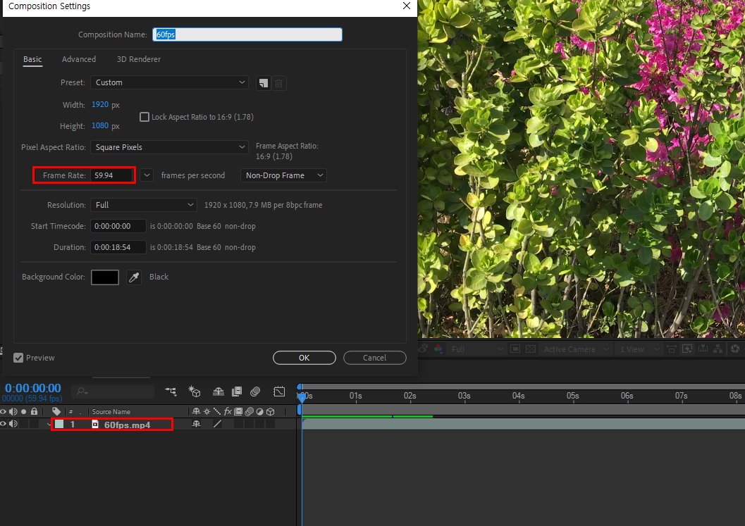 6)프로젝트에 60fps의 동영상을 가져오기하고 60프레임레이트의 컴포지션을 생성합니다.