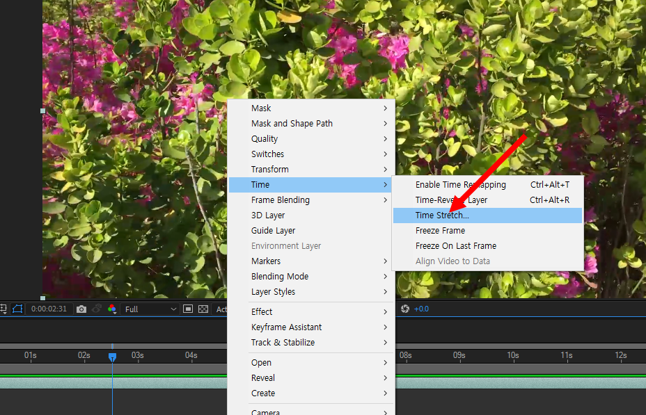 2)동영상을 선택하고 상단의 layer 메뉴에서 time의 time stretch을 선택합니다.