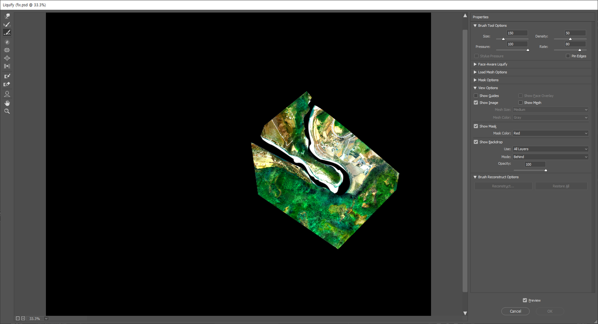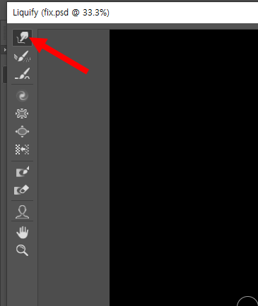 4)liquify 필터 좌측 상단의 forward warp tool는 클릭, 드래그하여 이미지의 픽셀을 앞으로 밀어냅니다.
