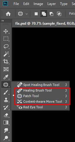 9)patch tool(또는 healing bruish tool, content-aware move tool)를 사용하여 늘어진 부분을 수정합니다.