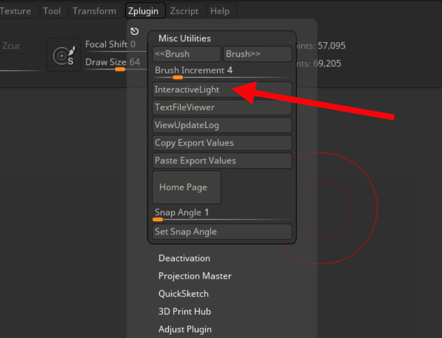 3)상단 Zplugin 메뉴에서 misc utilities의 interactive light를 활성화합니다(단축키 ctrl+p)