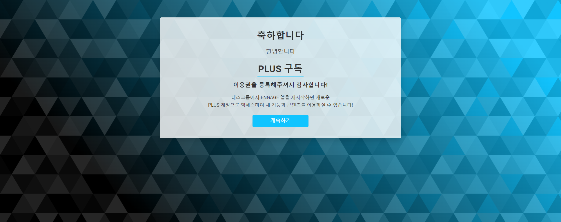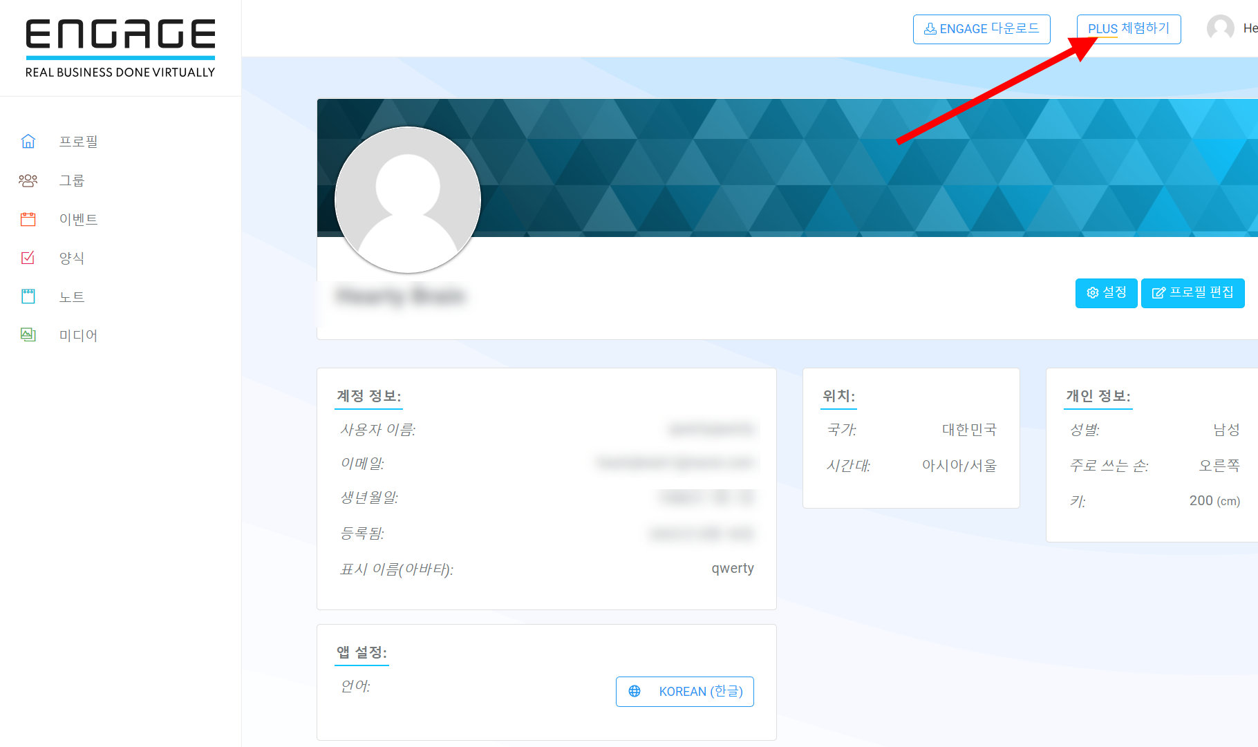 1)아래 인게이지 사용자 메뉴 홈페이지에서 로그인하고 우측 상단의 PLUS 체험하기로 이동합니다.