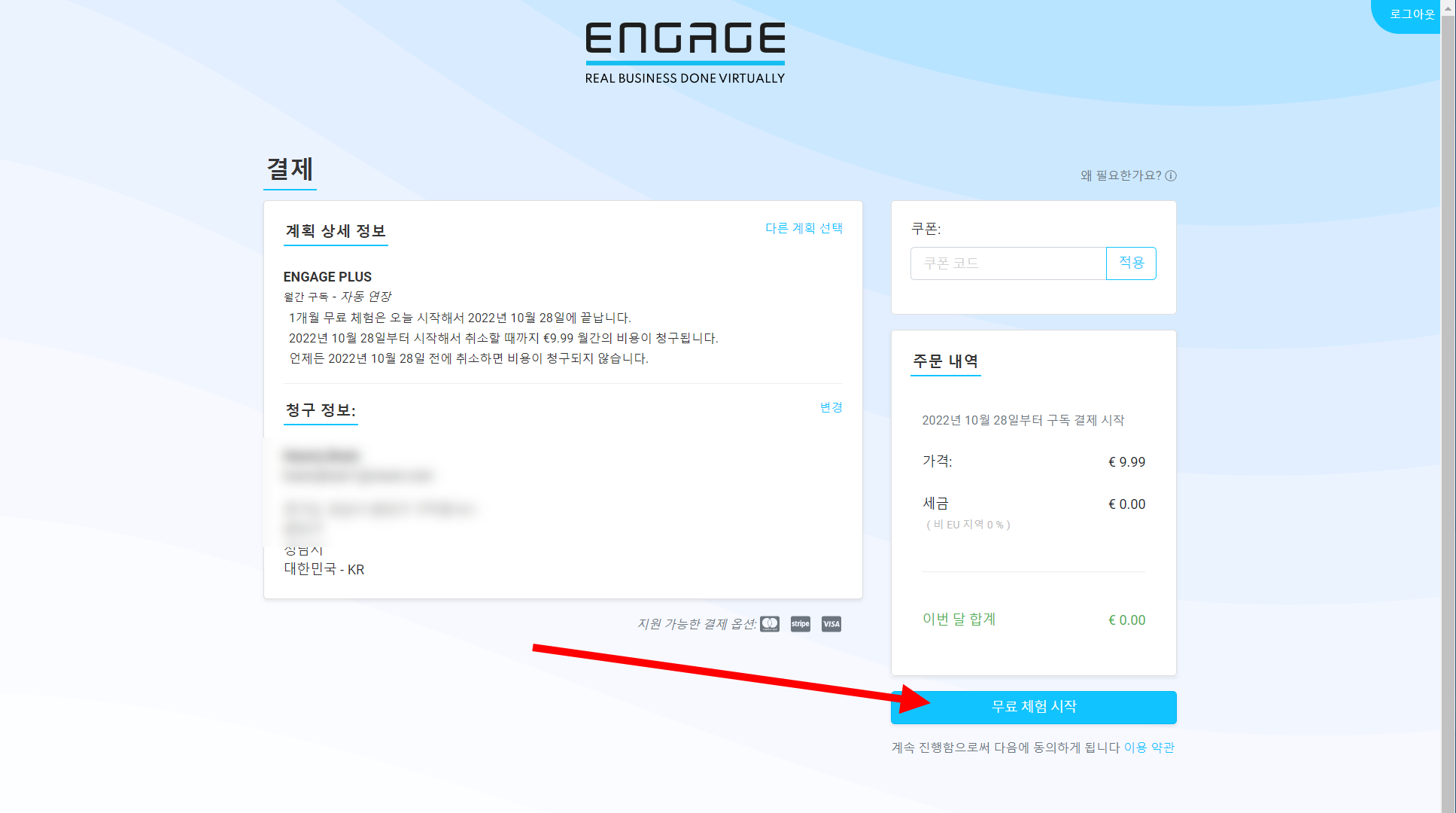 3)결제의 계획 상세정보, 청구정보, 주문내역을 확인하고 무료 체험 시작으로 이동합니다.