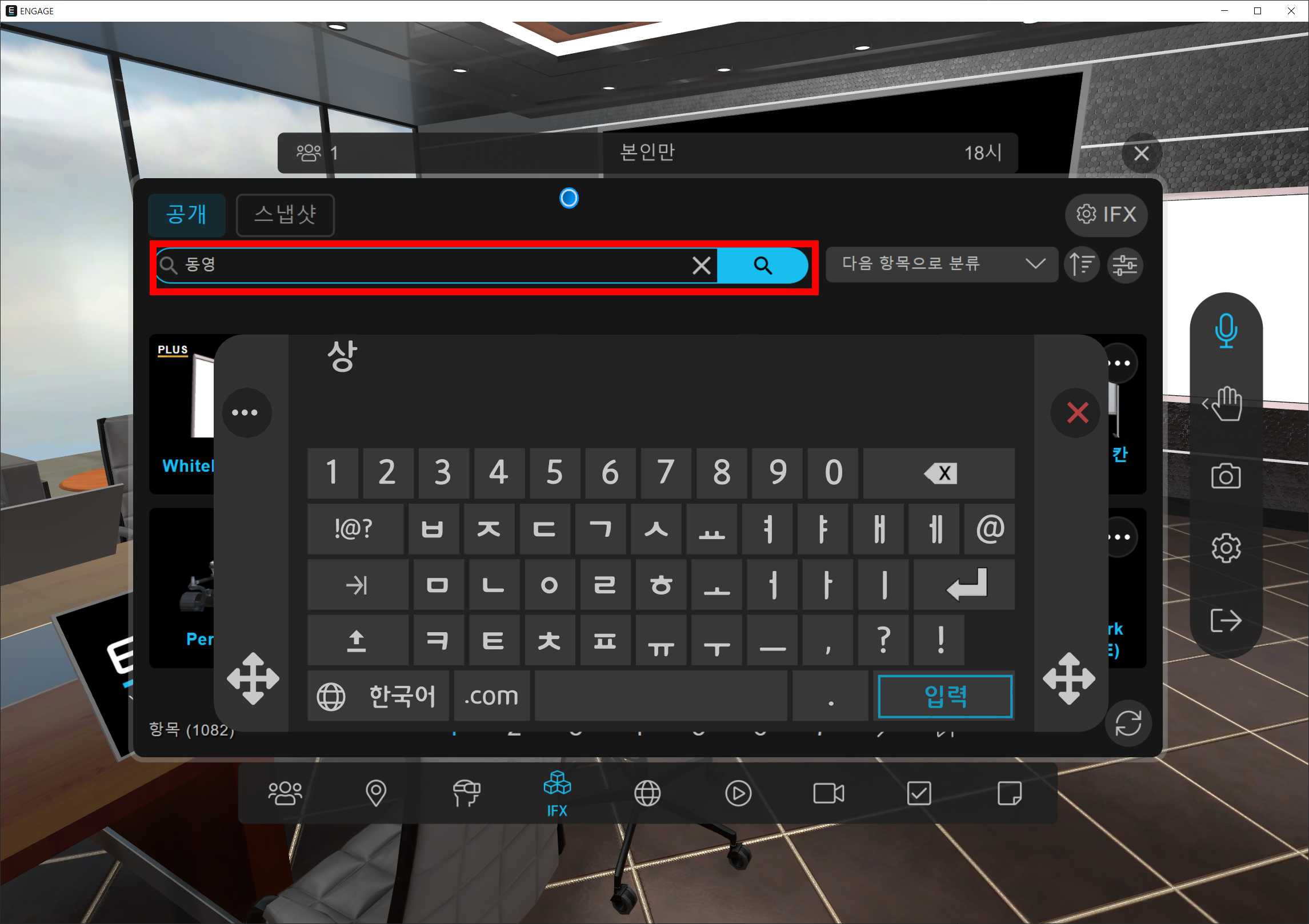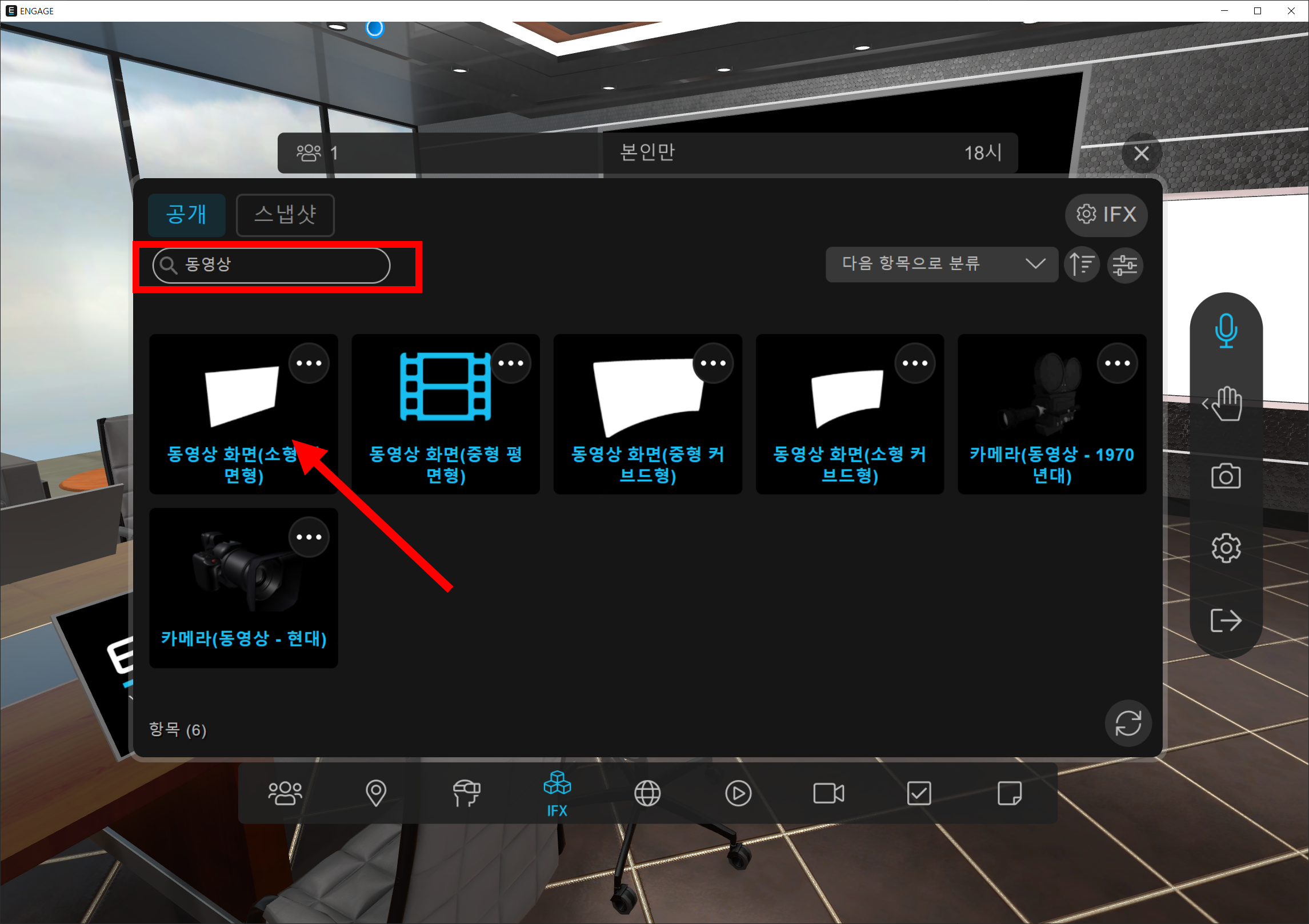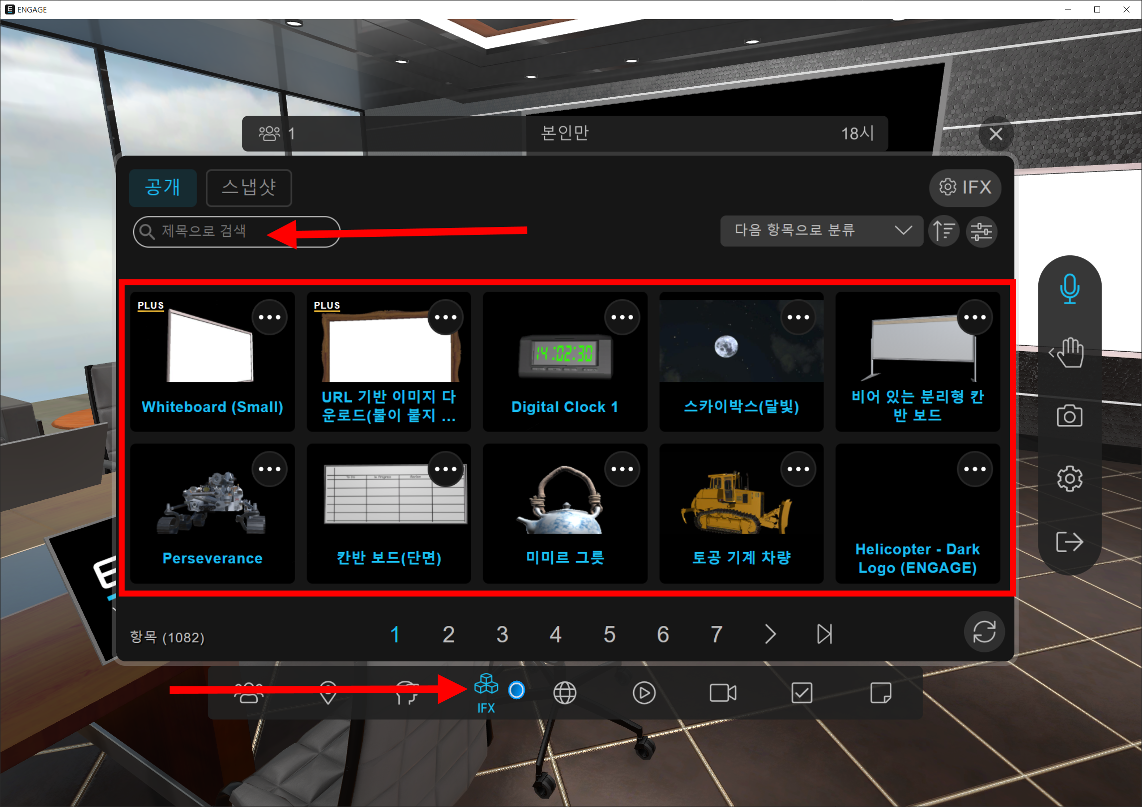 8)IFX 메뉴를 선택하면 공간에 추가할수있는 다양한 종류의 오브젝트 목록을 표시합니다. 제목으로 검색을 클릭합니다.