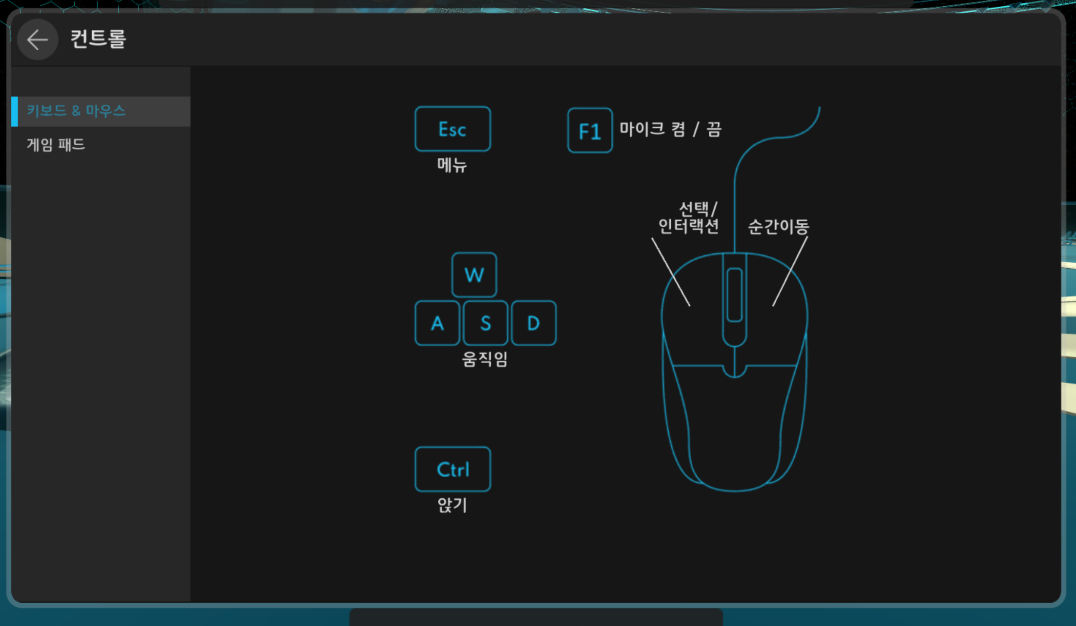 (WASD - 이동, Esc - 메뉴, ctrl - 앉기, 마우스 좌클릭 - 선택 및 상호작용, 마우스 우클릭 - teleport)