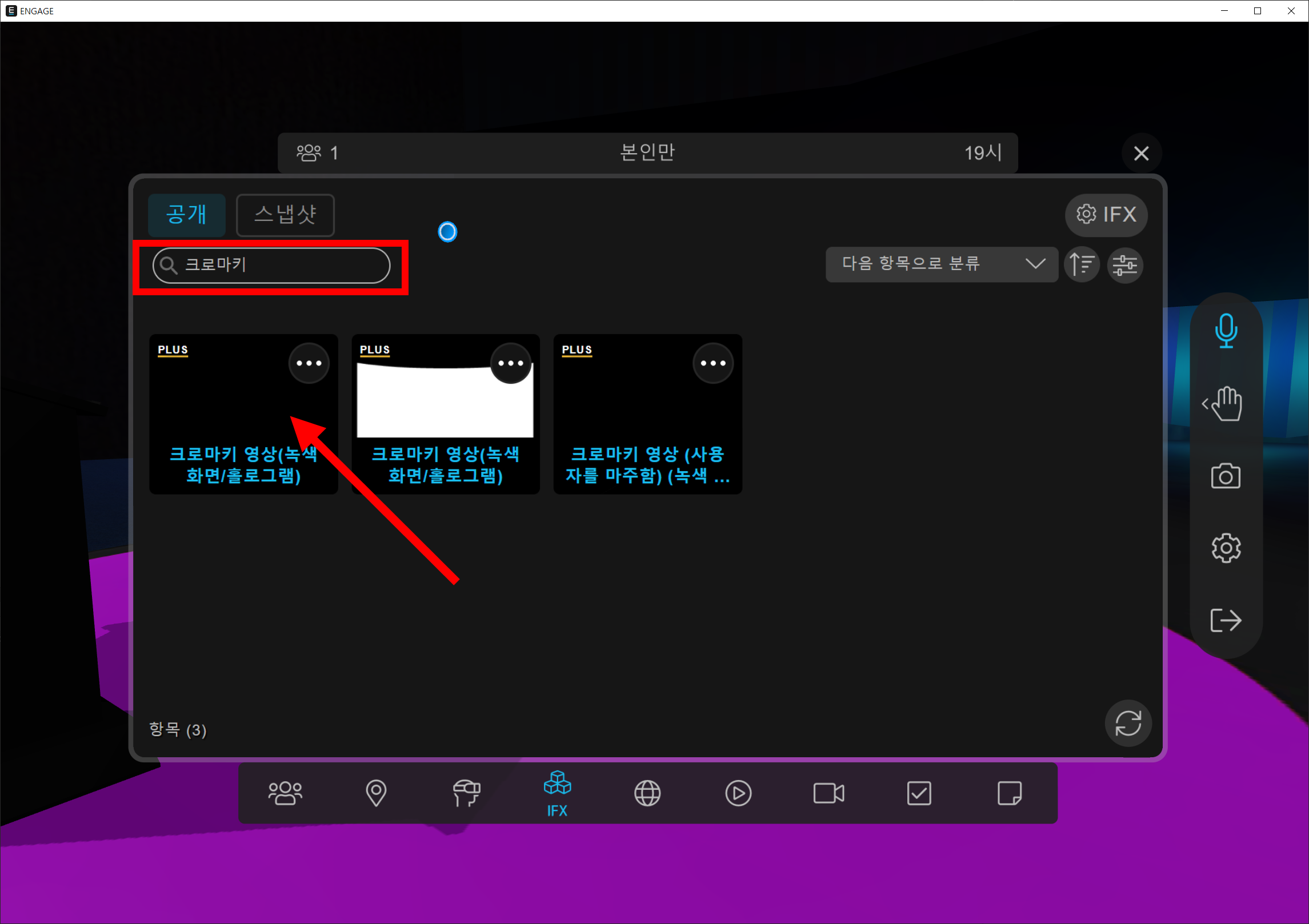 3)크로마키 영상 유형의 오브젝트를 검색합니다. 예에서 크로마키 영상(녹색 화면/홀로그램)을 선택하였습니다.