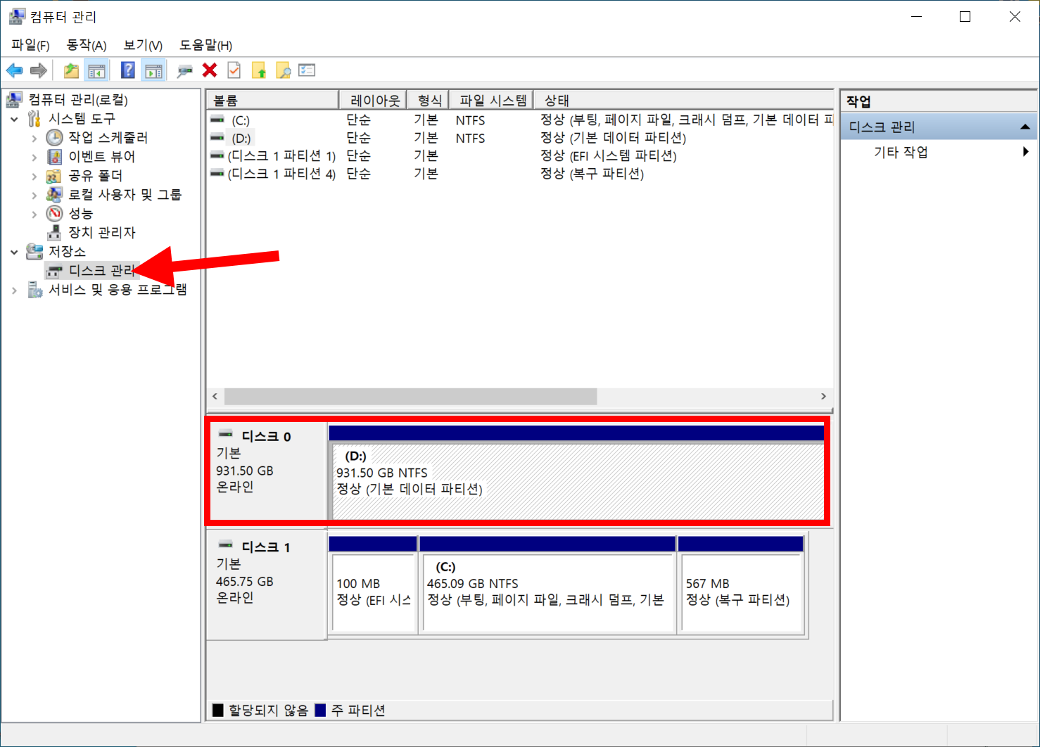 3)좌측의 디스크 관리를 선택합니다. 컴퓨터에 설치한 디스크의 상태가 정상인것을 확인할수있습니다.