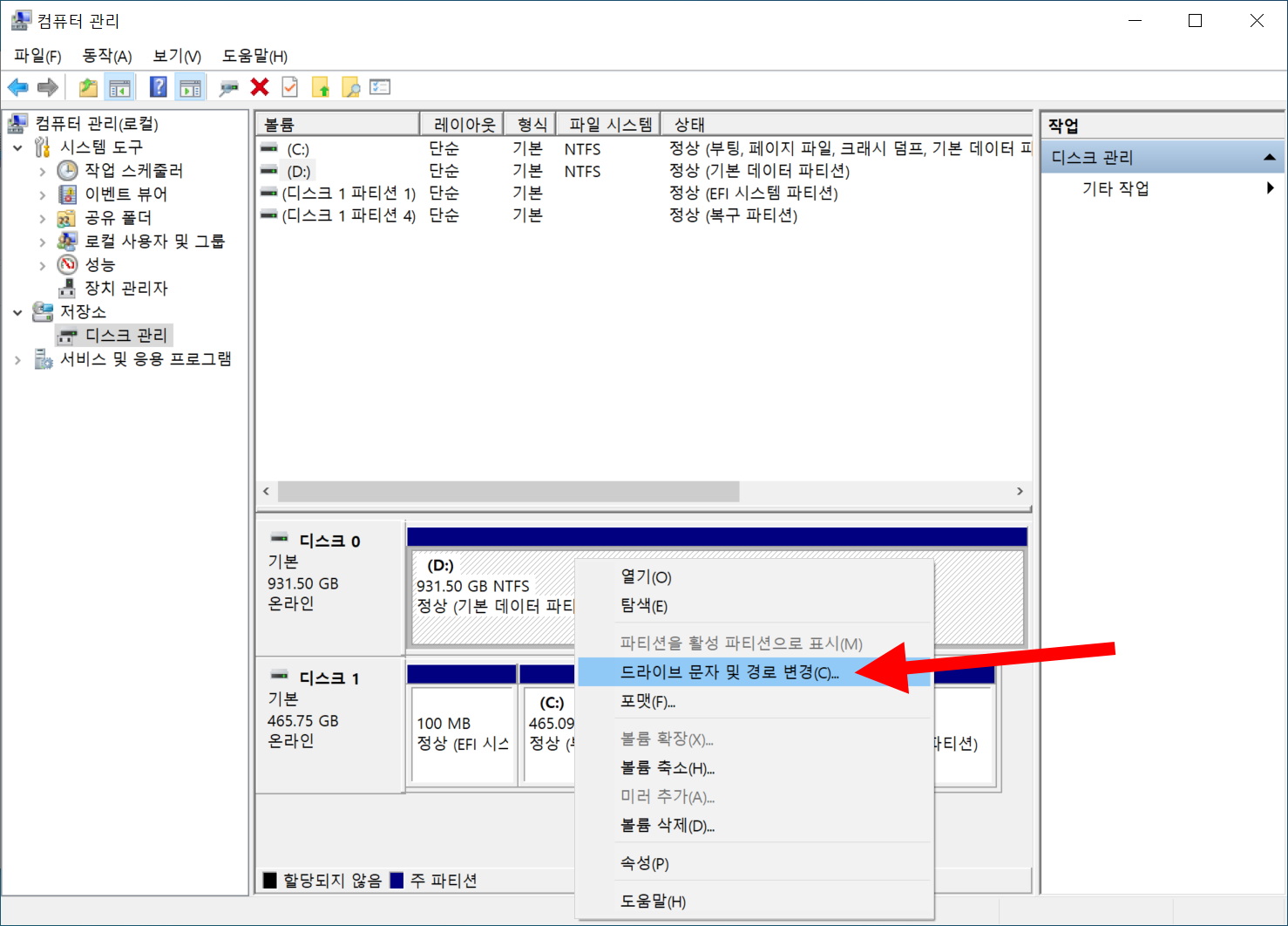 4)해당 디스크를 선택 및 마우스 우클릭하고 드라이브 문자 및 경로 변경으로 이동합니다.