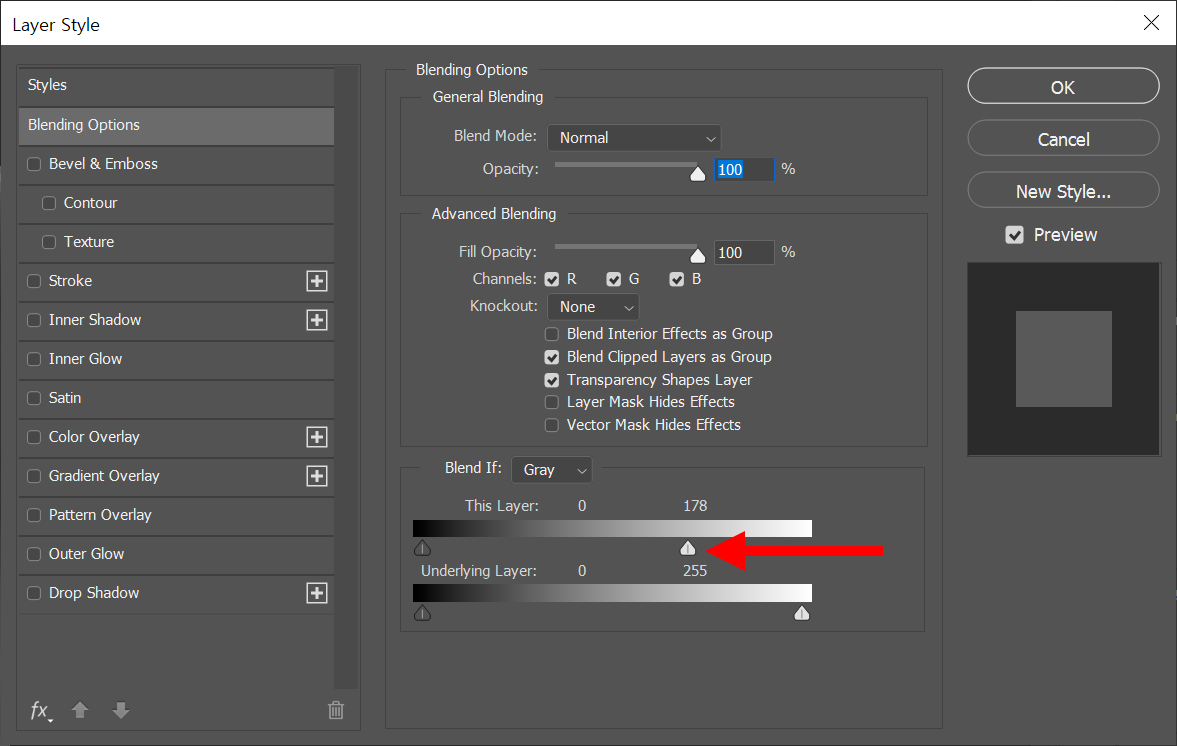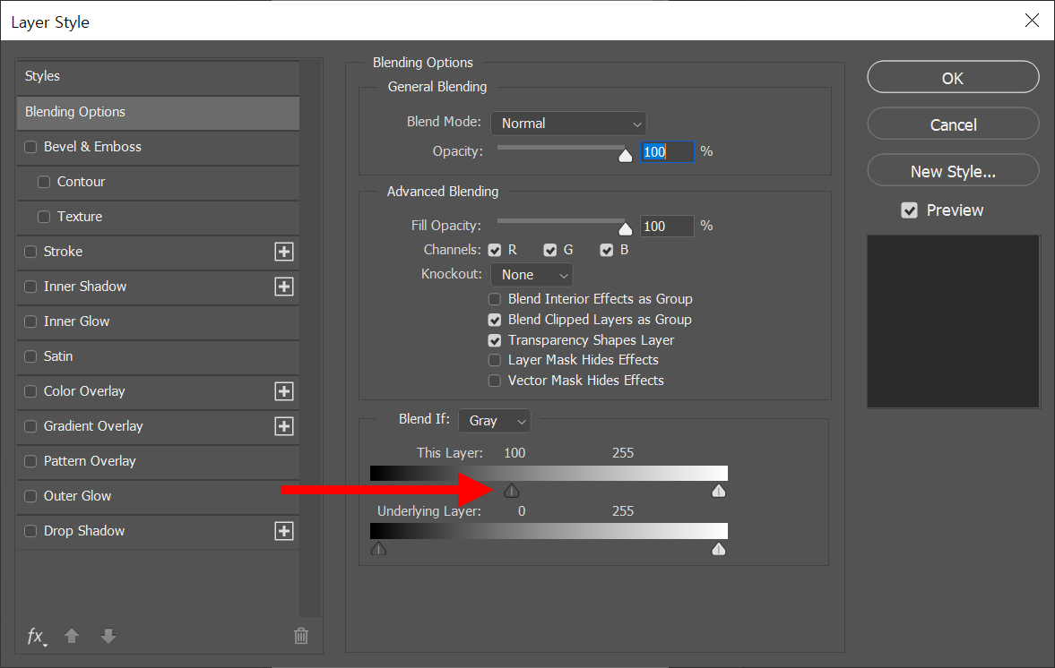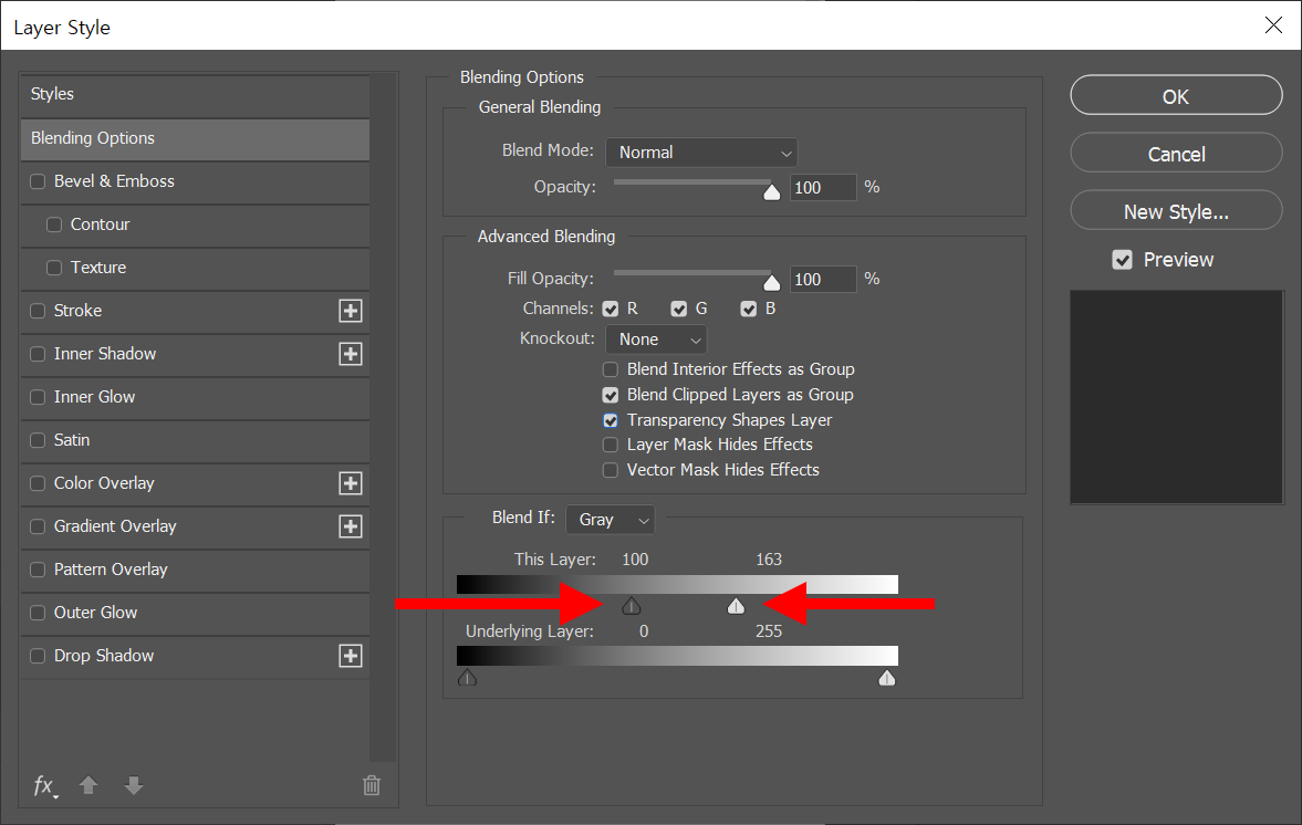 2)blend if에서 검정색 및 흰색 조절자를 이동시키면 해당 색을 제거하며 투명한 영역으로 설정합니다.