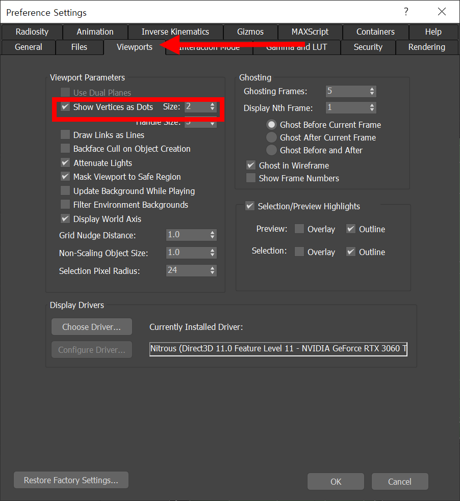 3)viewports 탭의 show vertices as dots를 확인합니다.