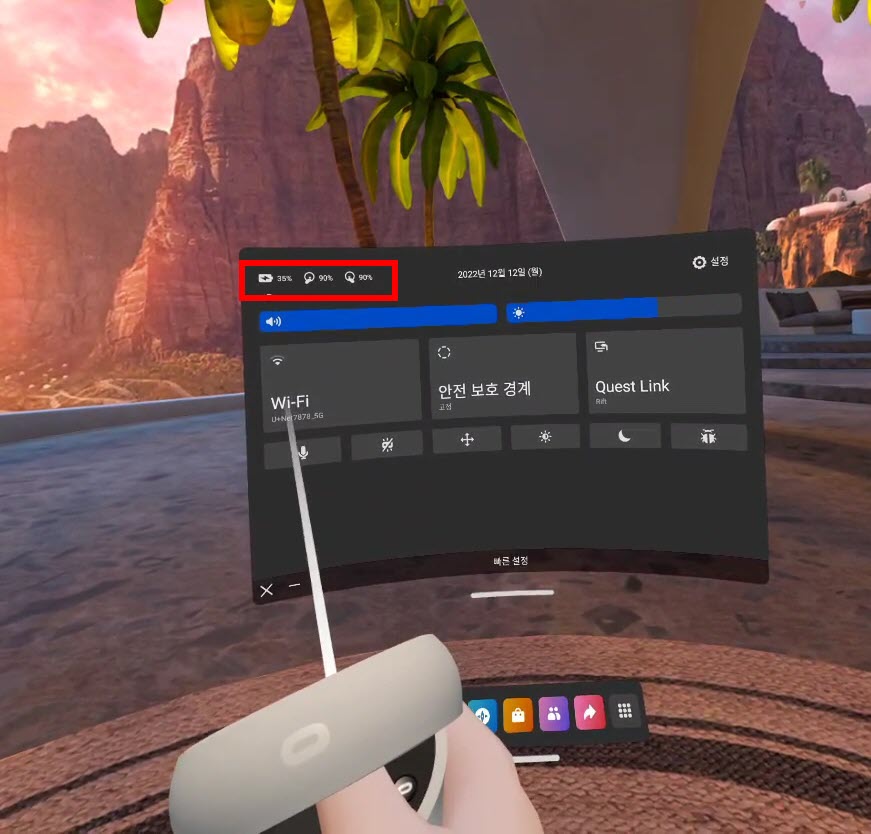 오큘러스 퀘스트2에서 헤드셋 및 컨트롤러 배터리 사용량 확인