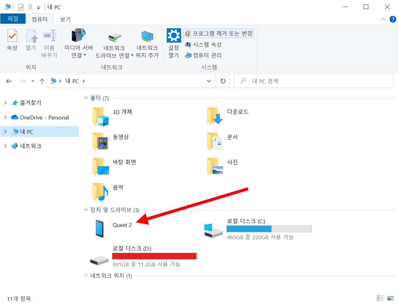 2)내 PC의 장치 및 드라이브에서 오큘러스 퀘스트2 장치를 확인할수있습니다.