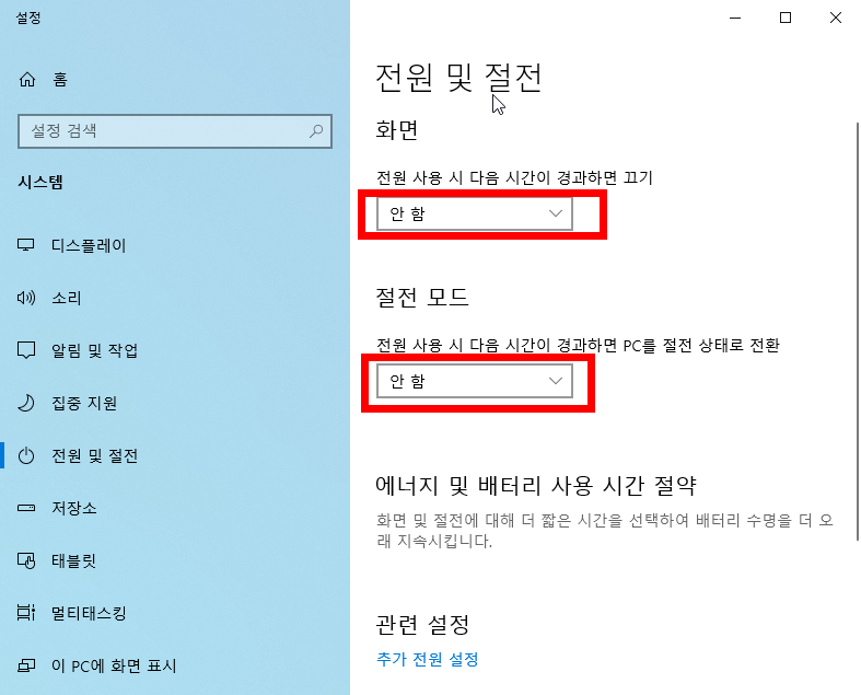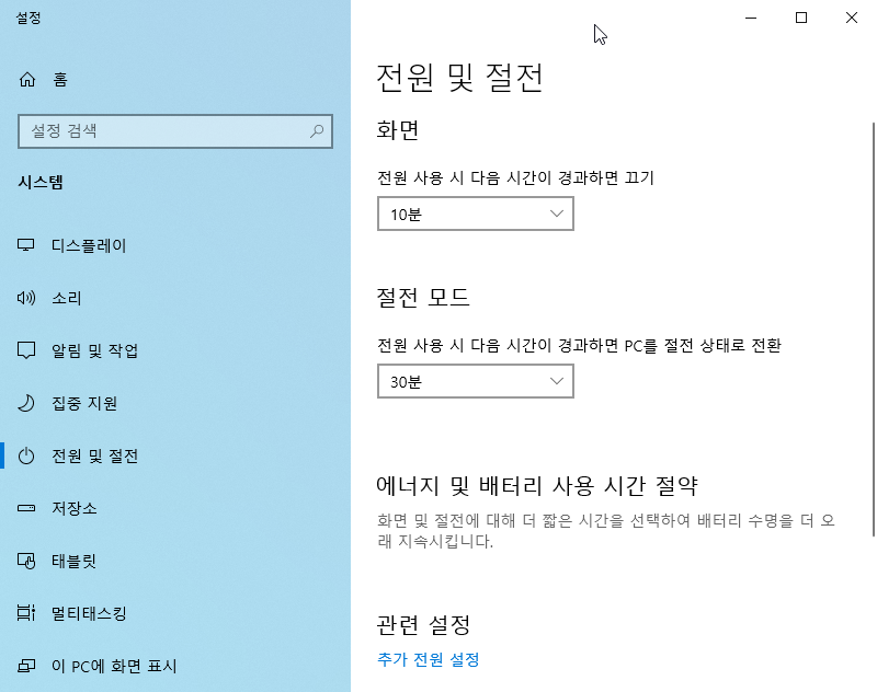 4)화면 및 절전모드에 대해서 시간이 설정되어있는것을 확인할수있습니다.