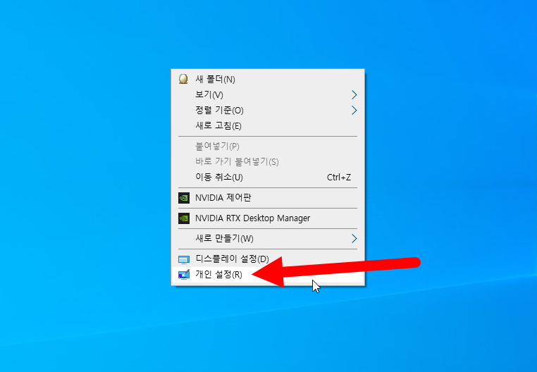 1)바탕화면에서 마우스 우클릭하고 개인 설정으로 이동합니다.