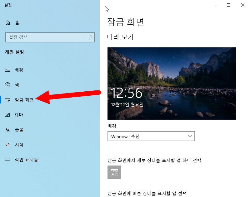 2)개인 설정의 잠금 화면으로 이동합니다.
