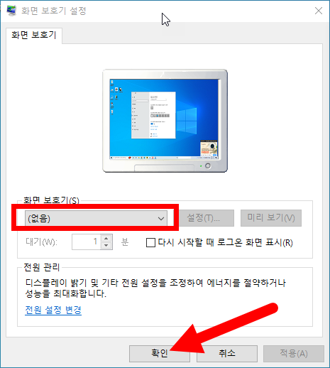 7)화면 보호기 없음을 선택하고 확인합니다.
