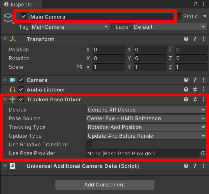 4)카메라는 Tracked Pose Driver 컴포넌트를 가지고있습니다.