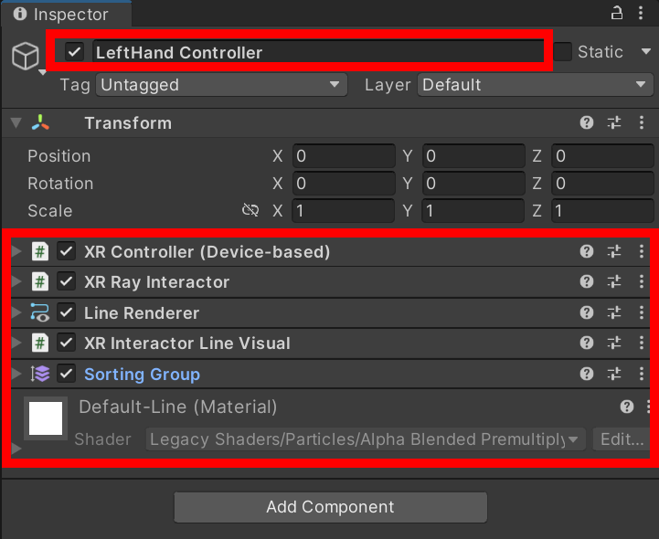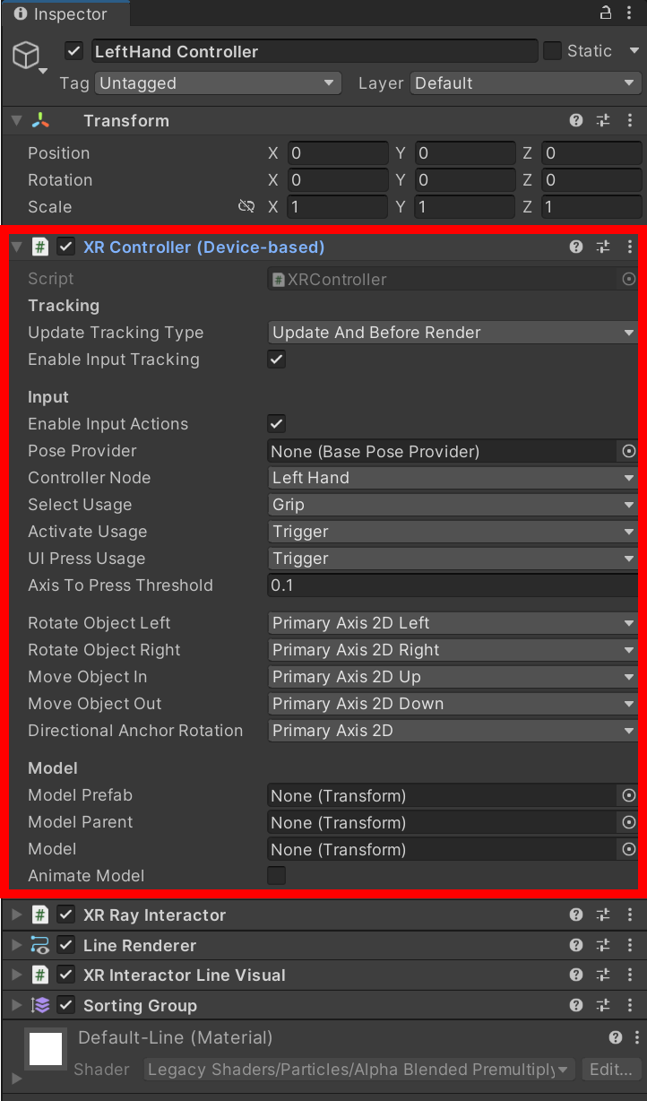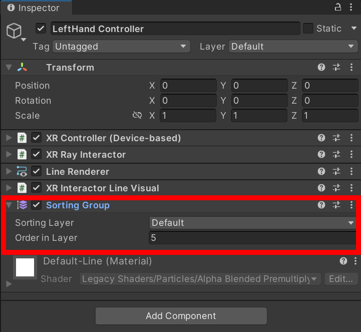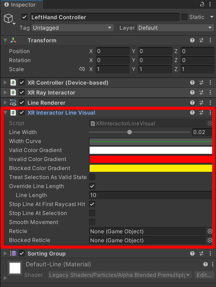 5)좌우 컨트롤러는 XR Controller(Device-based), XR Ray Interactor, Line Renderer, XR Interactor Line Visual, Sorting Group 컴포넌트를 가지고있습니다.