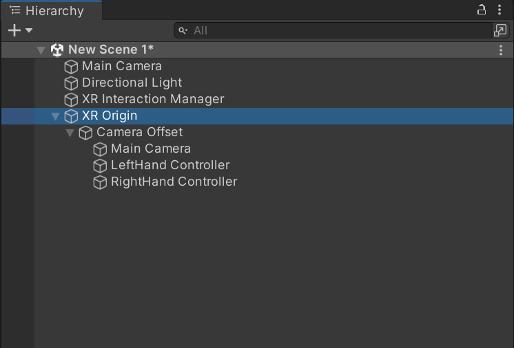 3)XR Origin 하위에는 카메라 오프셋과 메인 카메라, 좌우컨트롤러를 포함합니다.