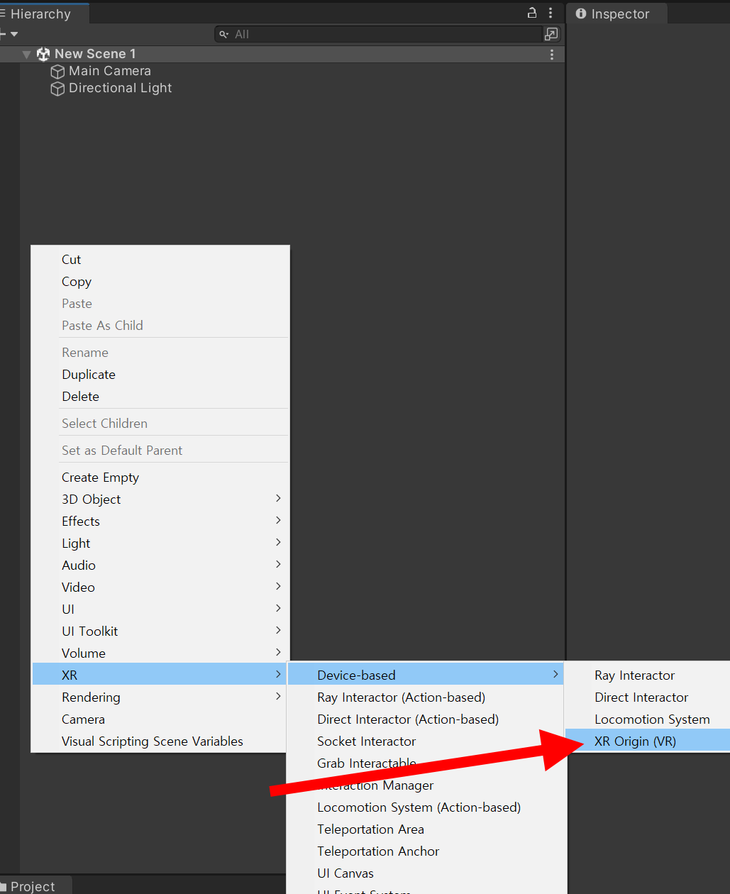 1)씬에 Device-based의 XR Origin(VR) 게임오브젝트를 생성합니다.