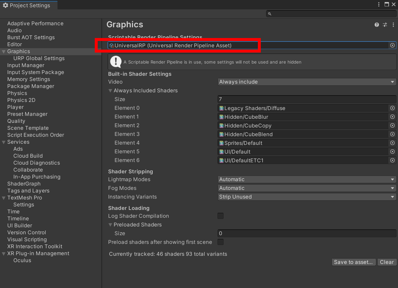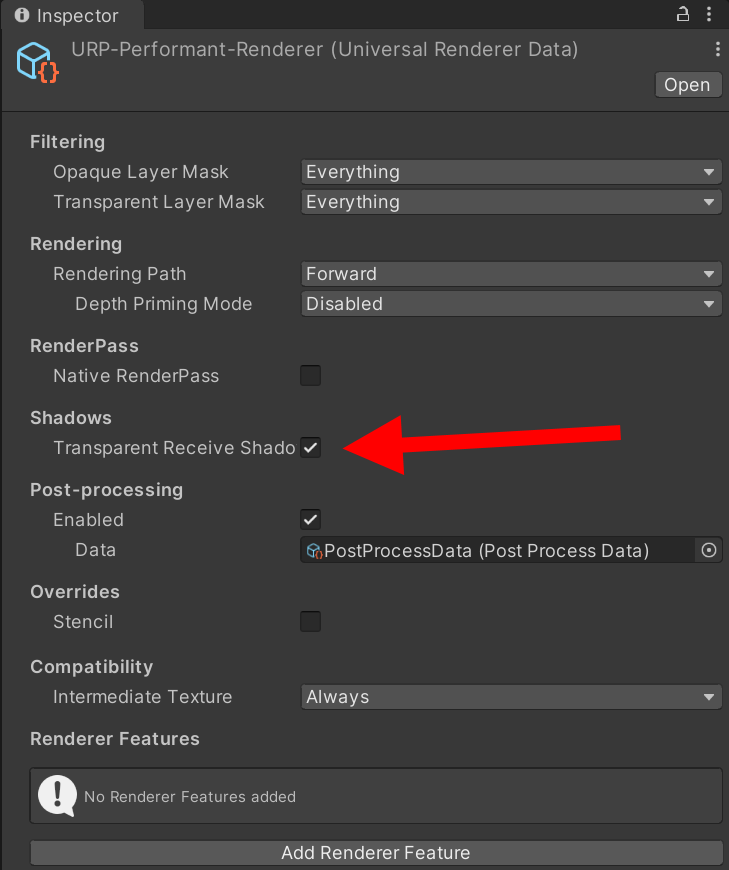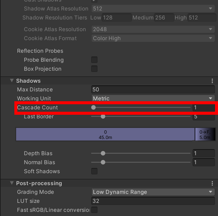 URP 에셋에서 transparent receive shadow에 체크하고 그림자의 cascade count 속성에 수치 1로설정합니다.