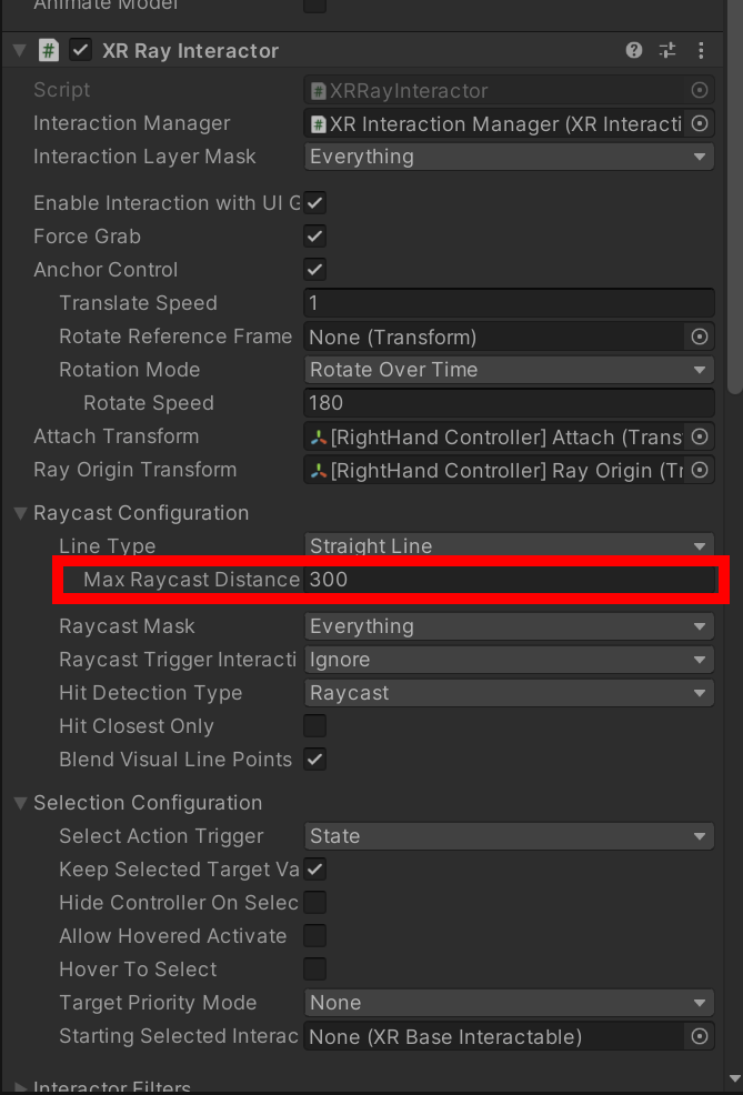 XR Ray interactor의 최대 레이캐스트 거리를 의미합니다. 수치가 클수록 더 원거리의 Interactable와 상호작용할수있습니다.