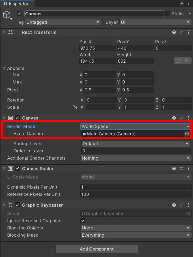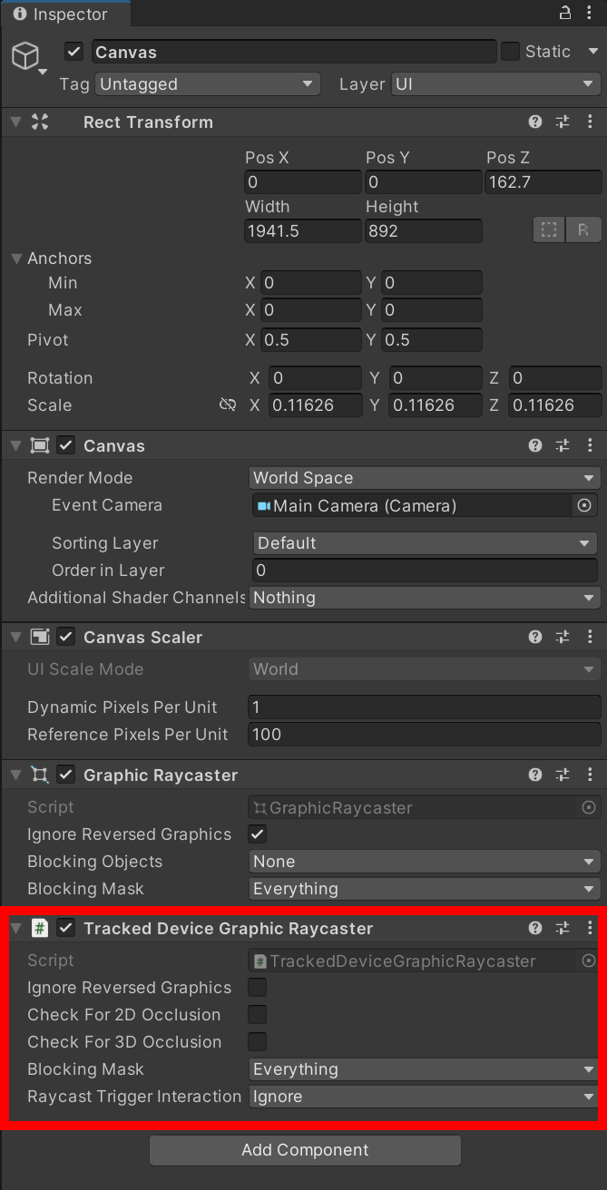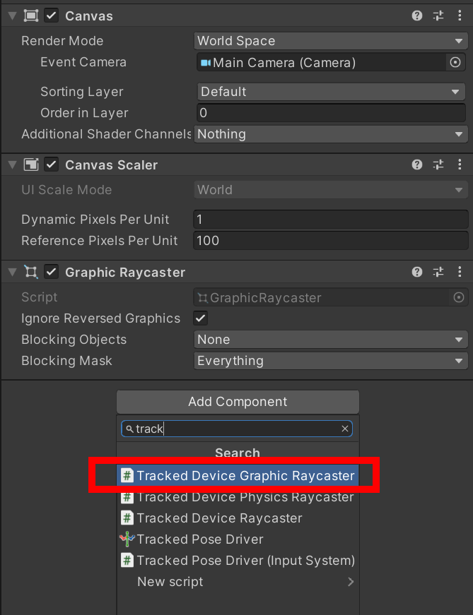 6)캔버스에 Tracked Device Graphic Raycaster 컴포넌트를 추가합니다.