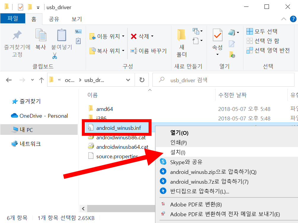 2)android_winusb.inf 파일을 선택하고 마우스 우클릭한후 설치를 진행합니다.