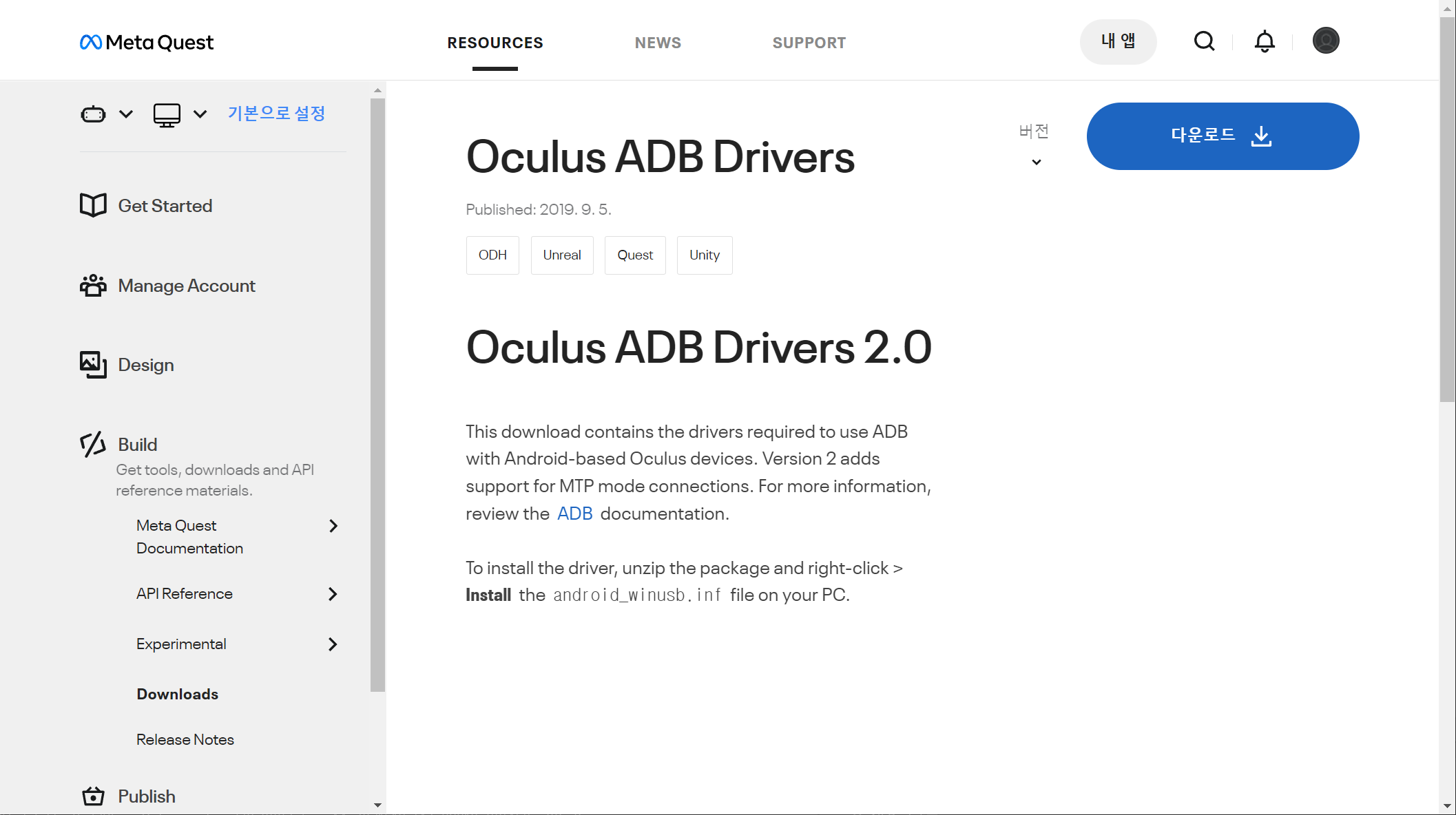 1)오큘러스 ADB 드라이버가 필요한경우 아래 웹사이트에서 다운로드할수있습니다.