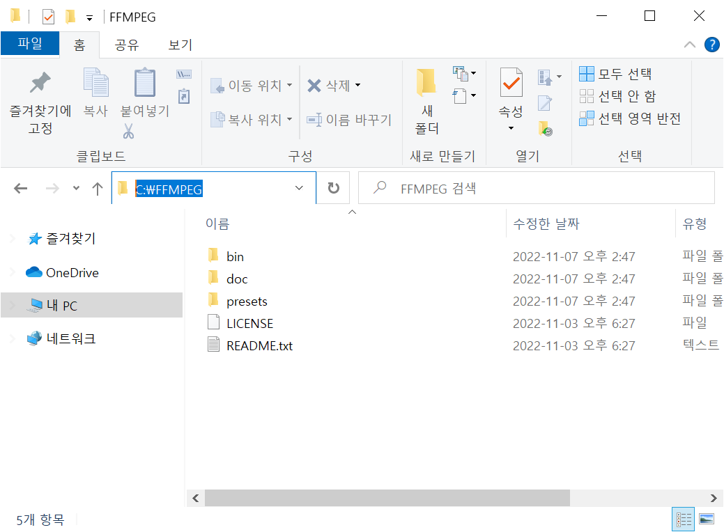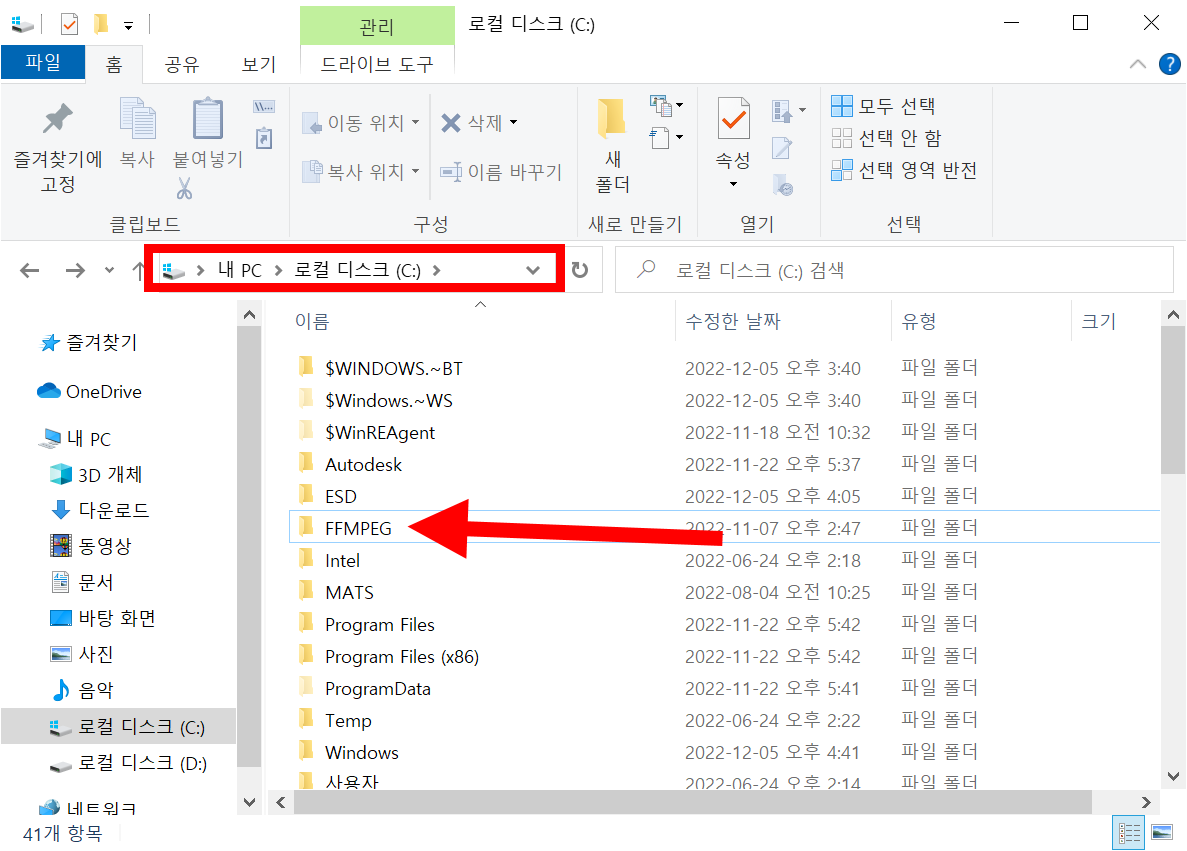 4)압축풀기한 폴더를 c드라이브에 위치시킵니다.