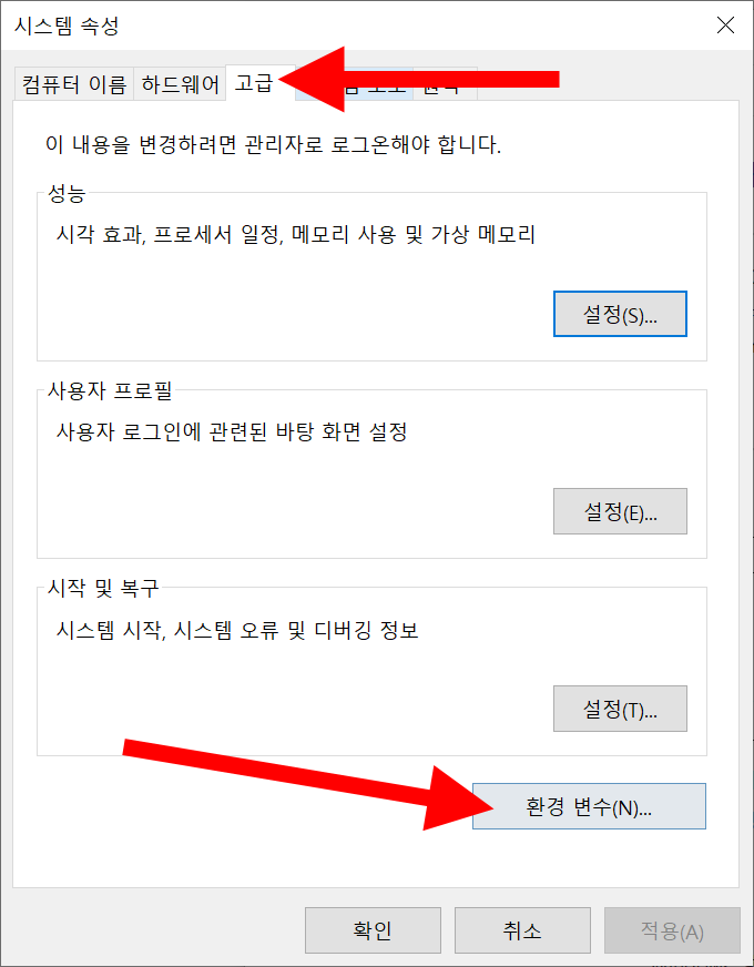 7)시스템 속성에서 고급 탭의 환경 변수로 이동합니다.