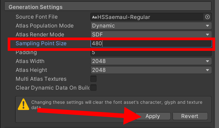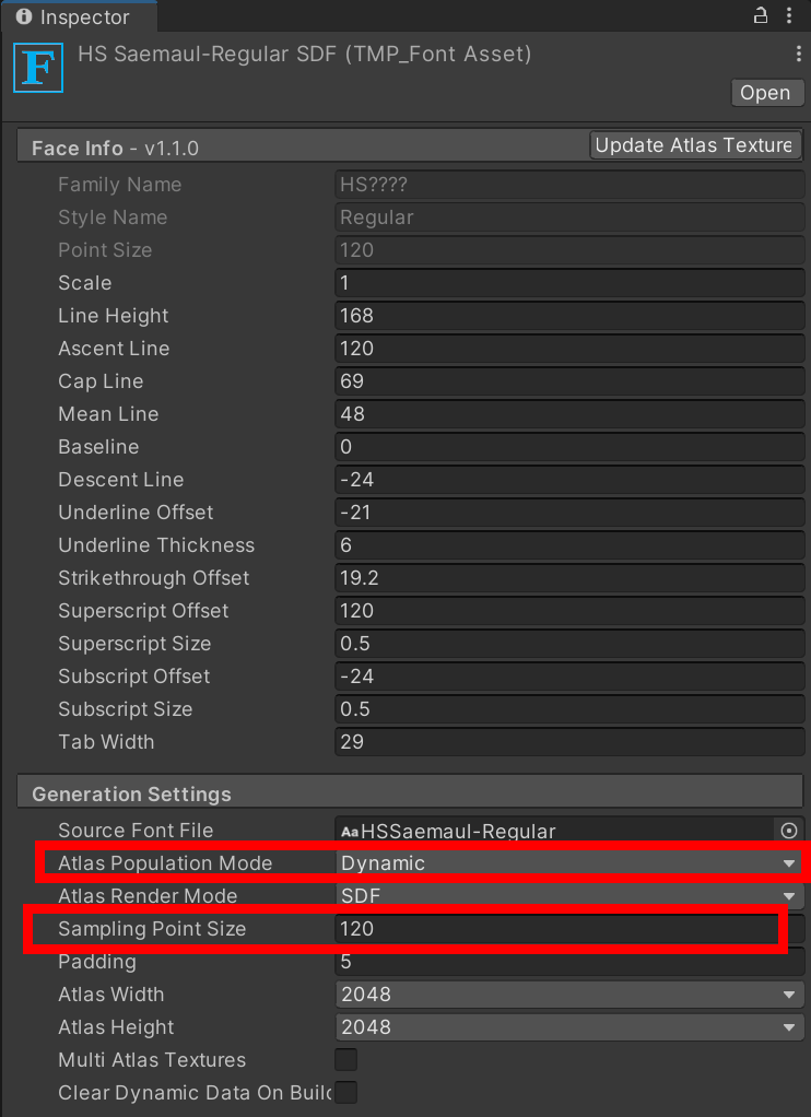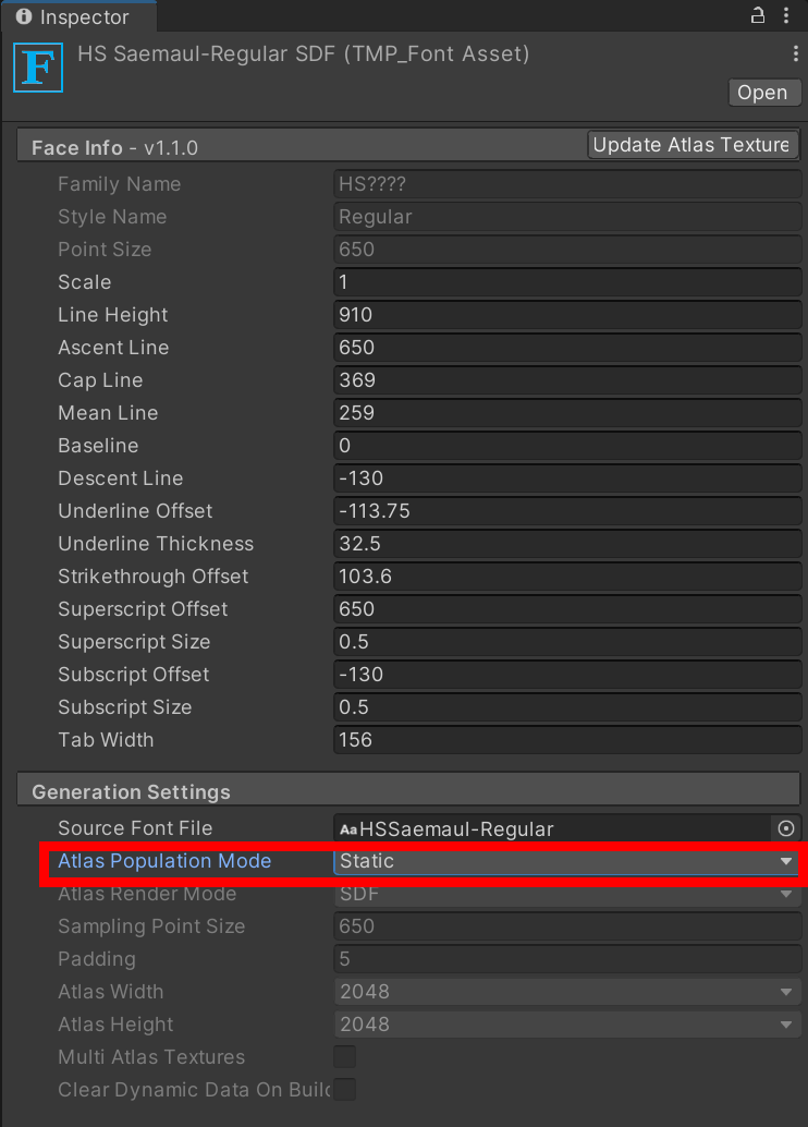 3)해당 TextMeshPro 글꼴 에셋을 선택하고 generation settings에서 atlas population mode가 static로 설정되어있는것을 확인할수있습니다.