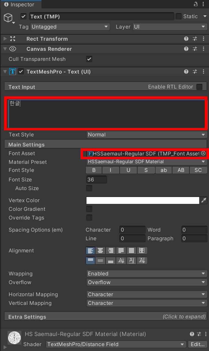 유니티에서 TextMeshPro에서 한글 글꼴 텍스트 사용하기