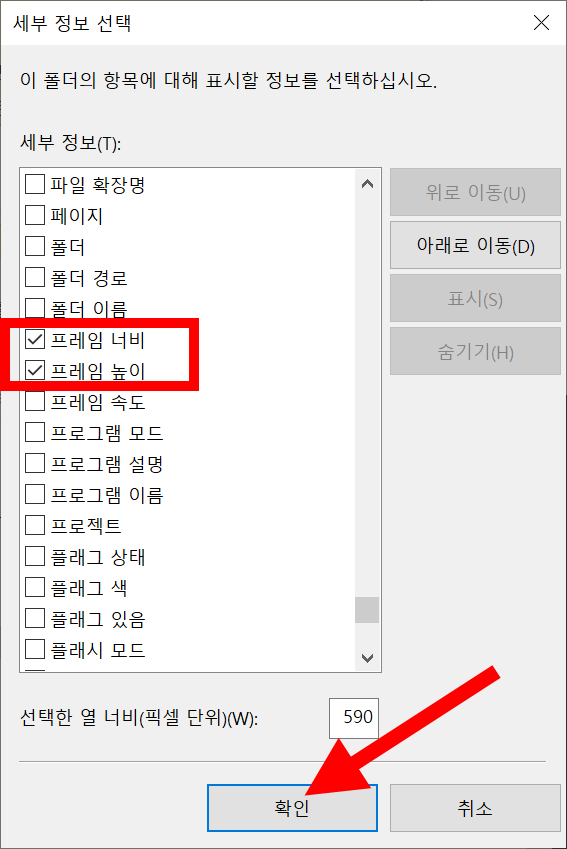 3)세부 정보 선택에서 프레임 너비, 프레임 높이에 체크하고 확인합니다.