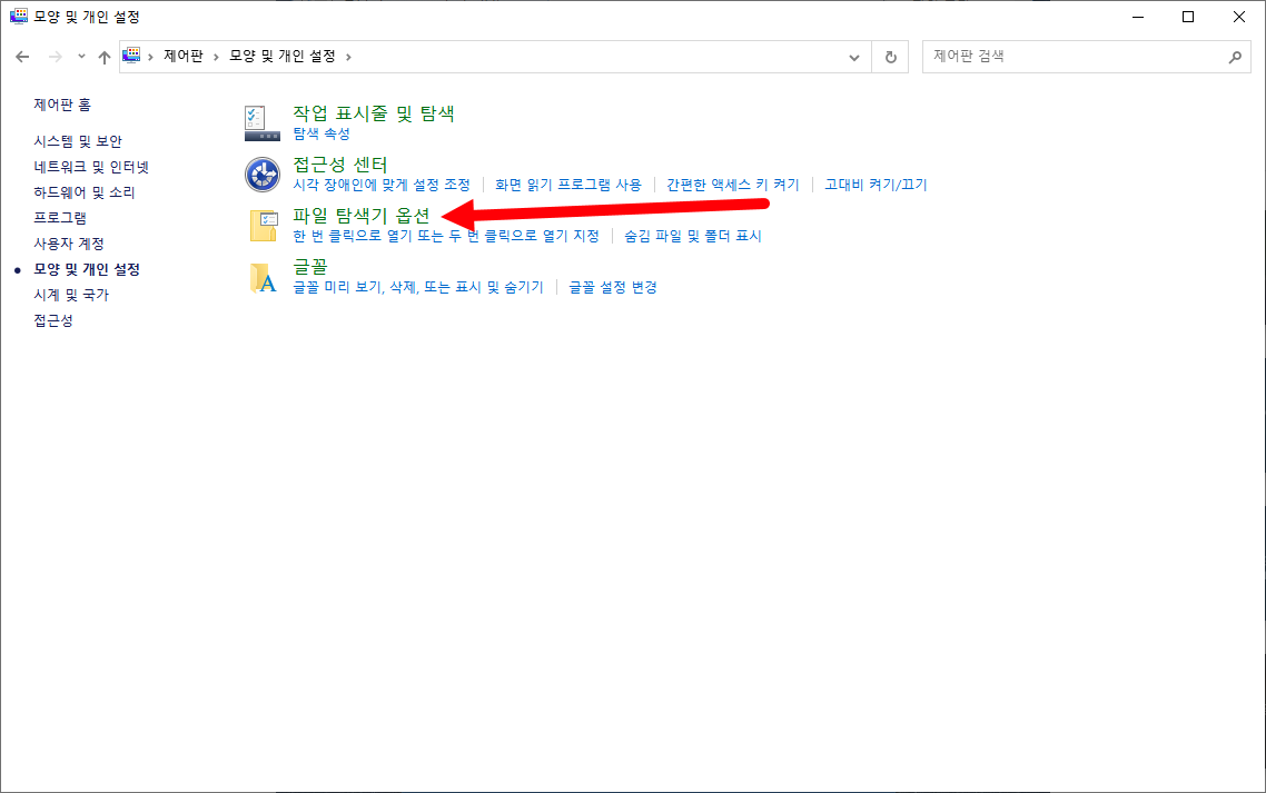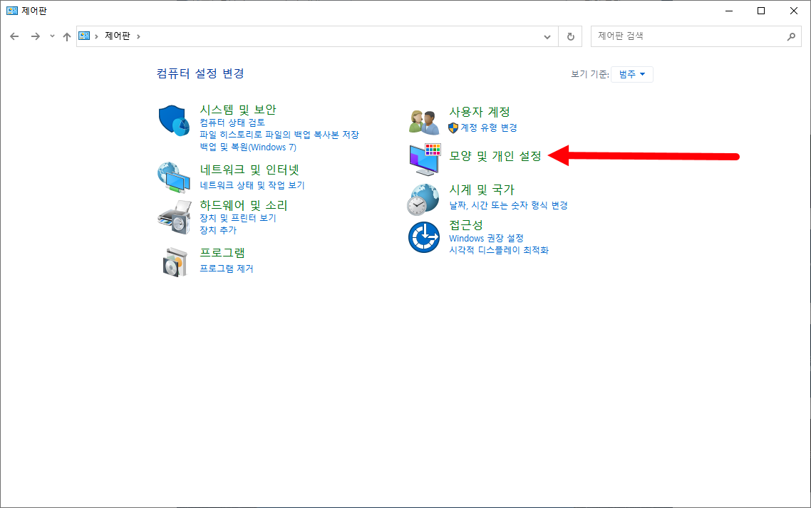 1)제어판의 모양 및 개인설정으로 이동합니다.