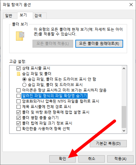 4)알려진 파일형식의 파일 확장명 숨기기를 체크해제하고 확인합니다.