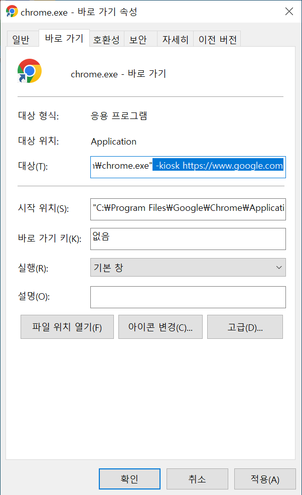 4)경로의 마지막에 띄어쓰기 -kiosk 웹사이트URL 를 입력합니다.