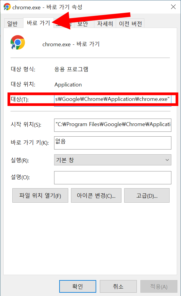 3)바로 가기 탭의 대상에서 경로를 확인합니다.