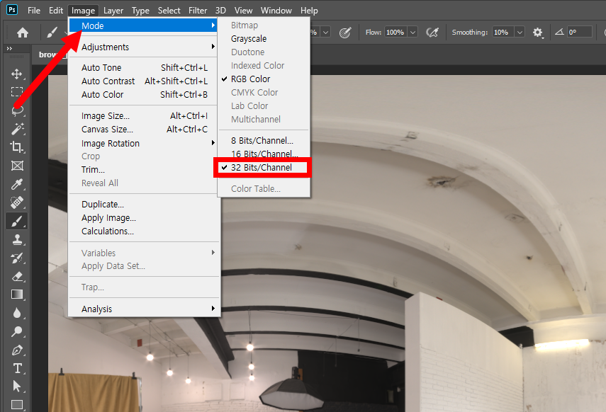 2)상단 image 메뉴의 modes에서 32bhts/channel로 설정되어있는것을 확인할수있습니다.