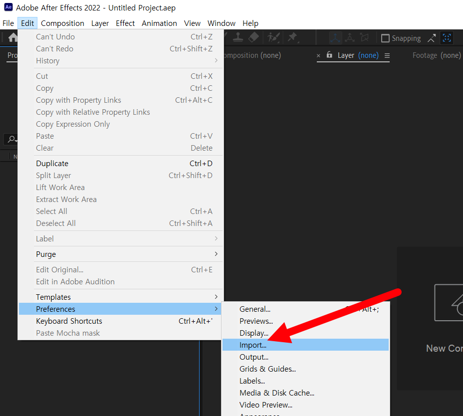 3)상단의 edit 메뉴에서 preferences의 import로 이동합니다.