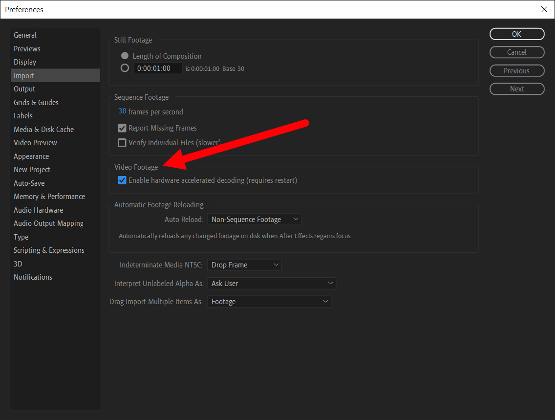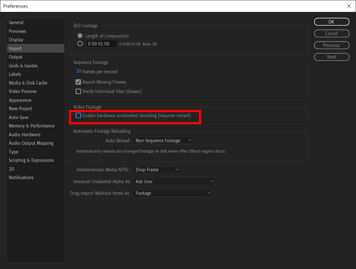 4)video footage의 enable hardware accelerated decoding(requires restart)에 체크되어있는것을 확인할수있습니다.