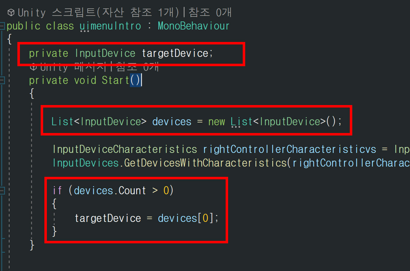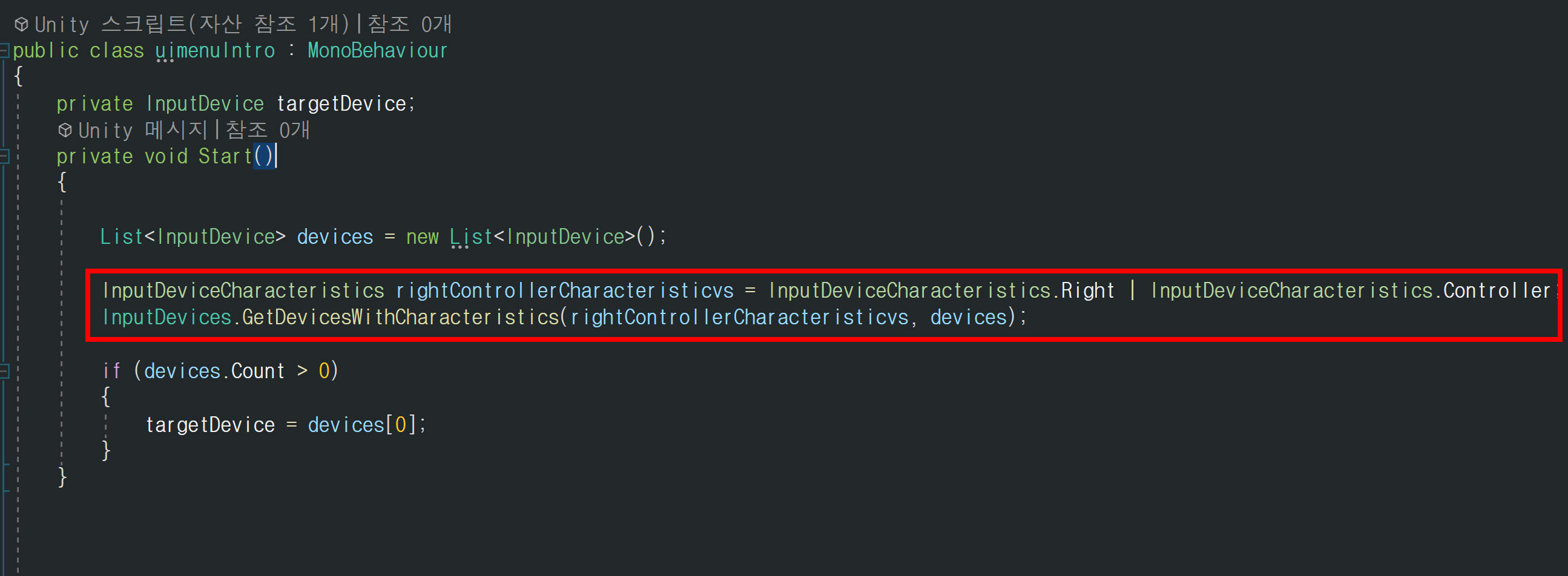 또 InputDevices.GetDevicesWithCharacteristics를 사용하여 특정한 기능 또는 용도의 장치를 가져오기합니다. 예에서 right, controller 특성을 가진 장치를 필터랑하여 가져옵니다.