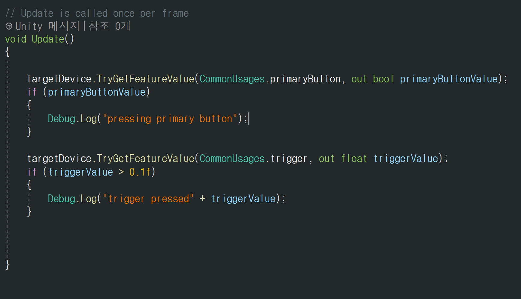 3)InputDevice.TryGetFeatureValue를 사용하여 장치의 버튼 입력 기능을 가져오기할수있습니다. 예에서 파라미터로 지정한 primaryButton, trigger 입력기능을 검색하고 bool, float 값을 출력합니다.