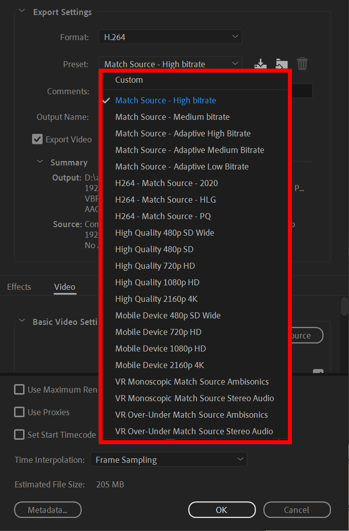 2)내보내기 설정(export settings)에서 기본으로 제공하는 프리셋(preset)목록을 확인할수있습니다.
