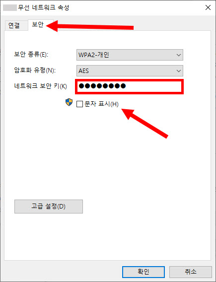 6)무선 네트워크 속성의 보안 탭으로 이동합니다. 네트워크 보안 키 하단의 문자표시에 체크합니다.