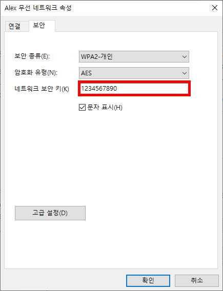 6)무선 네트워크 속성의 보안 탭으로 이동합니다. 네트워크 보안 키 하단의 문자표시에 체크합니다.