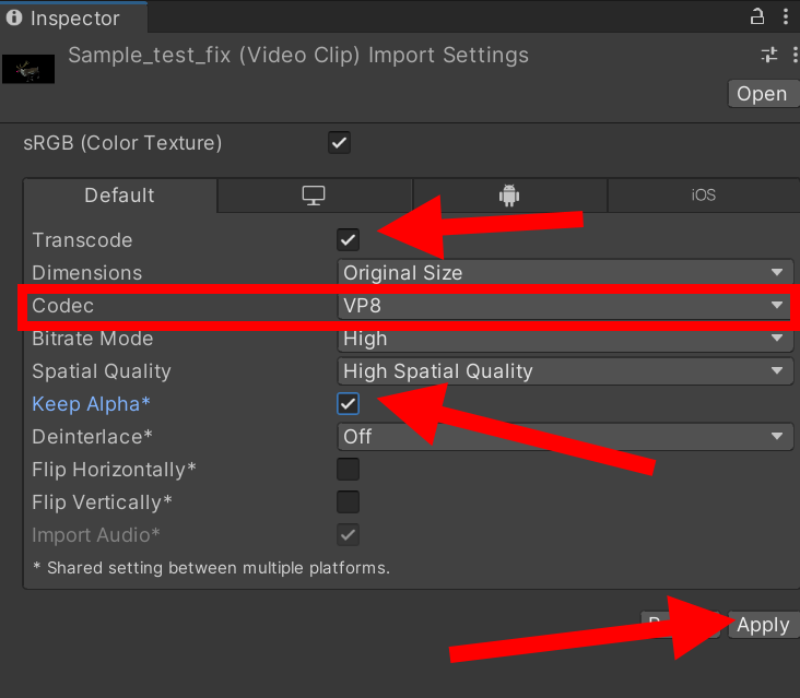 2)동영상 import settings에서 transcode에 체크하고 VP9코덱을 선택합니다. 알파를 지원하려면 keep alpha에 체크하고 적용합니다.