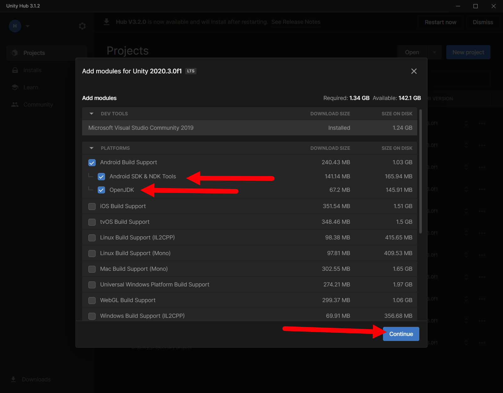 2)유니티 허브에서 해당 프로젝트의 유니티 에디터에 대해 모듈을 추가합니다. android build support(android SDK & NDK Tools, OpenJDK)에 체크하고 continue를 클릭합니다.