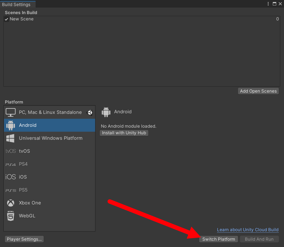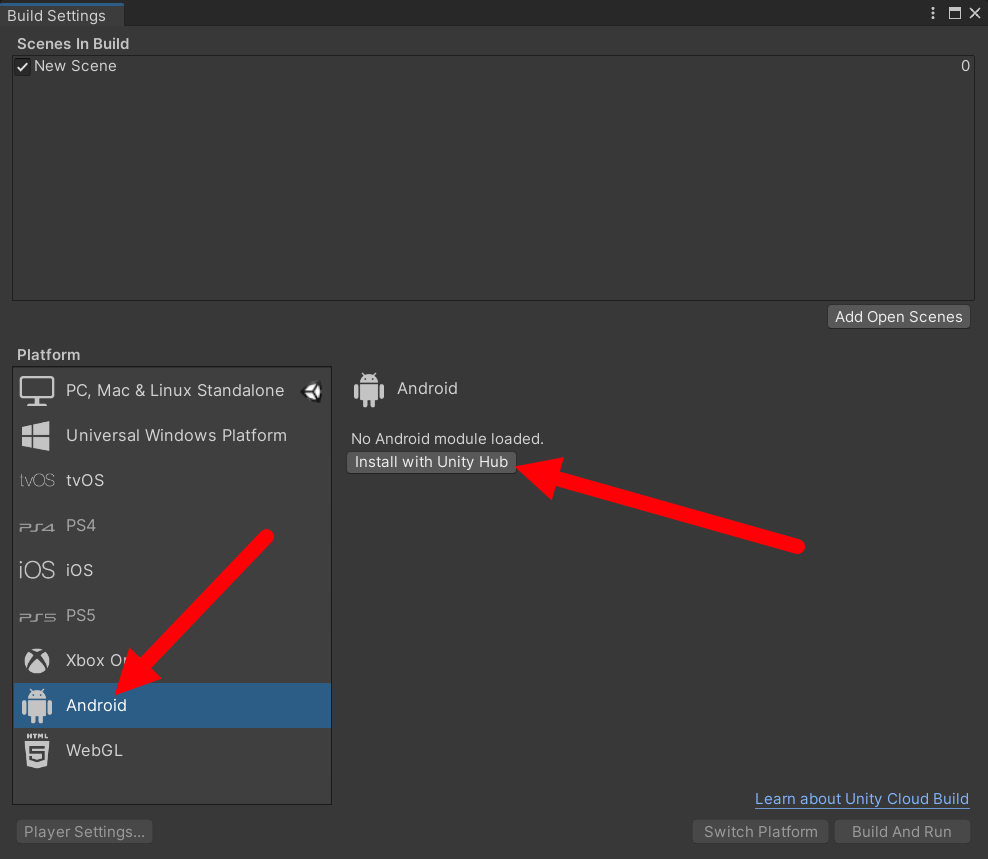 1)build settings에서 안드로이드 플랫폼을 선택하고 install with unity hub를 클릭합니다.
